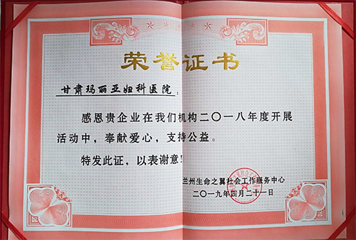 4月21日,兰州义工成立九周年暨兰州生命之翼社会工作服务中心成立两周年庆典在伏龙坪新春天庄园成功举办,政府部门相关领导、慈善书画家、爱心企业代表、诗人、作家、各公益组织负责人、高校青协志愿者等约两百多人参加了周年庆典公益活动。甘肃玛丽亚妇科医院作为与之合作的单位,此次荣获“爱心企业”荣誉,这是对玛丽亚在2018年公益慈善事业所做工作的极大肯定。